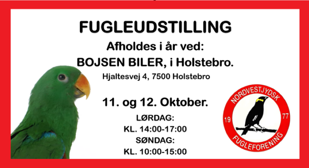 Posted on by « Alle Begivenheder Denne begivenhed er allerede afholdt. Fugleudstilling Holstebro 11. oktober @ 14:00 - 12. oktober @ 15:00 « Fugleudstilling 90 års Jubilæumsudstilling » Fugleudstilling hos Bojsen Biler, Holstebro Tilføj til kalender Google kalender iCalendar Outlook 365 Outlook Live Detaljer Start: 11. oktober @ 14:00 Slut: 12. oktober @ 15:00