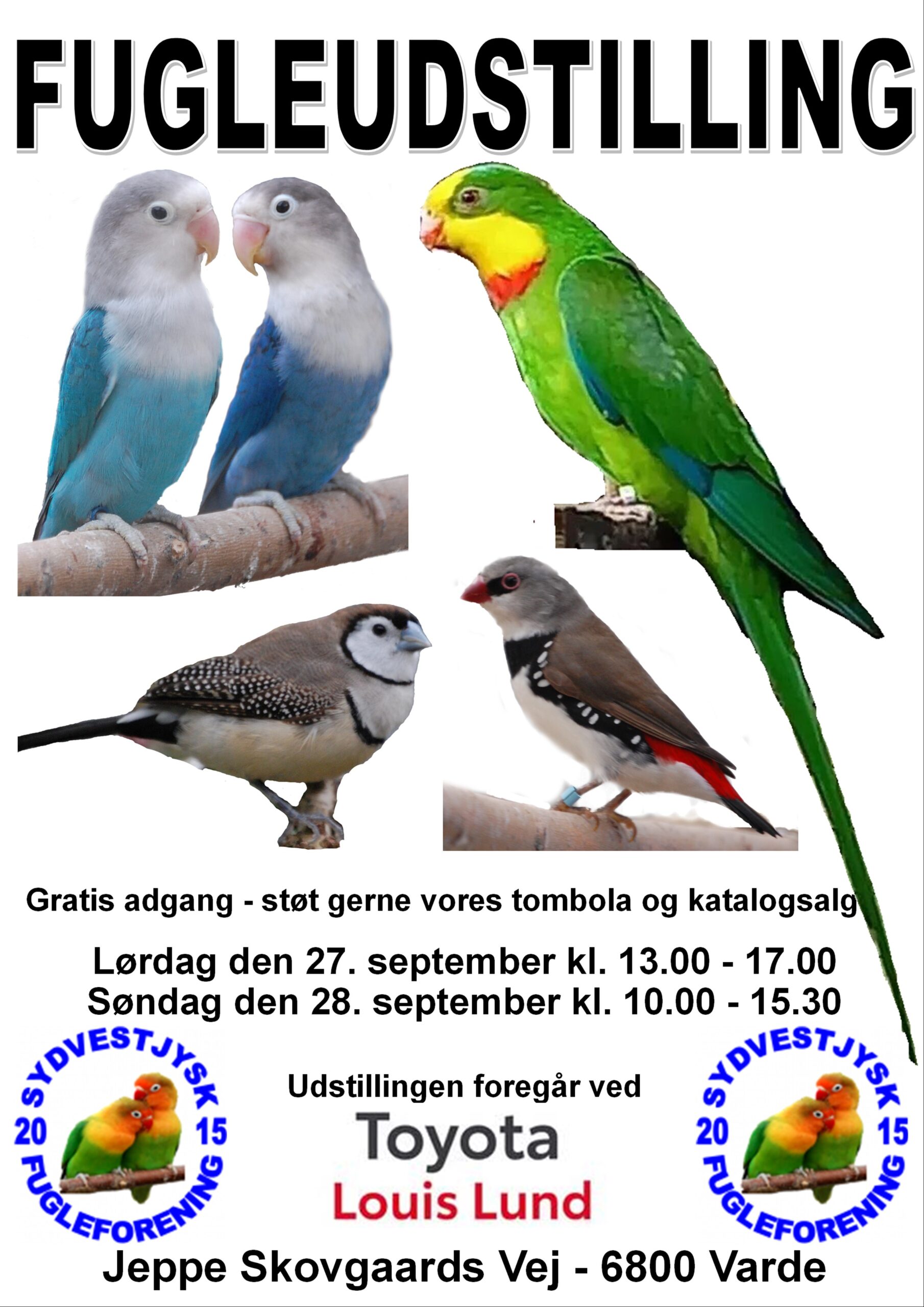 Posted on by « Alle Begivenheder Denne begivenhed er allerede afholdt. Fugleudstilling i Varde 27. september @ 13:00 - 28. september @ 15:30 « DM 2025 – Agapornis/Forpusdag KANARIE UDSTILLING » Sydvestjysk Fugleforening afholder udstilling i Varde – hos Louis Lund. Tilføj til kalender Google kalender iCalendar Outlook 365 Outlook Live Detaljer Start: 27. september @ 13:00 Slut: 28. september @ 15:30 Arrangør Sydvestjysk Fugleforening Sted Jeppe Skovgårds Vej 21, 6800 Varde Jeppe Skovgårds Vej 21 Varde, 6800 + Google Maps
