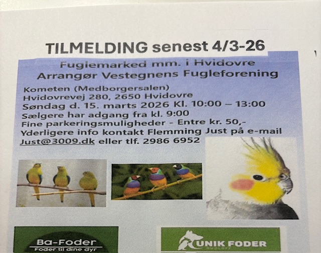Vestegnens Fugleforening Marked- SÆLGER TILMELDING senest 4/3-26 til Just@3009.dk eller 29866952