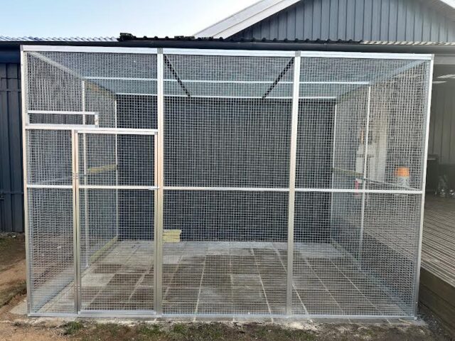 voliere af alu elementer der 3 m bred x 2 dyb x 2 høj bygget op ad mur på den ene bredside